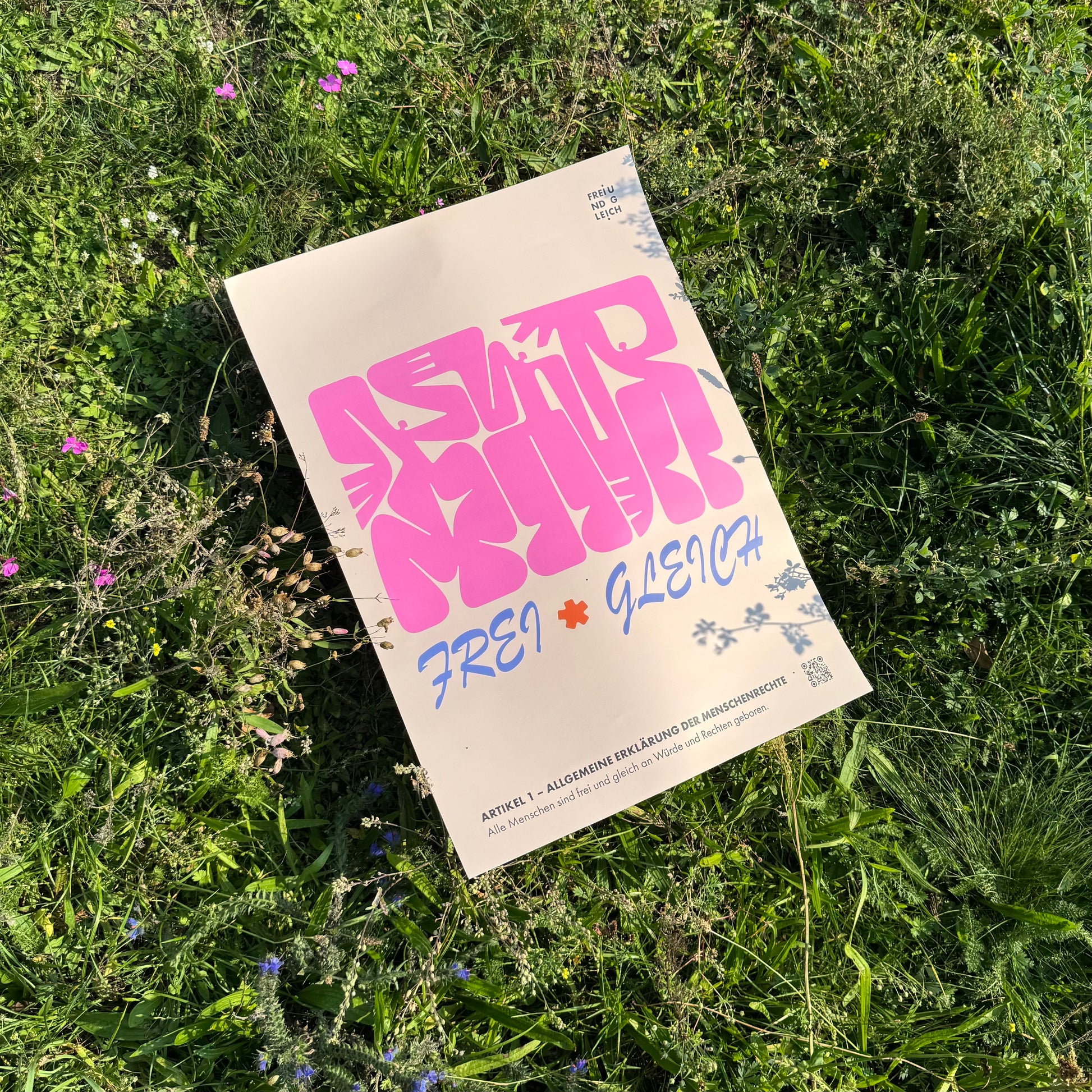 Der Auftakt stammt von Gabriel Holzner, dessen Stil von Pop Art, Graffiti und Expressionismus geprägt ist. Sein Entwurf für „Frei und Gleich“ lädt dazu ein, Menschenrechte nicht nur zu unterstützen, sondern sichtbar im Alltag zu zeigen. Ein Statement, das Gespräche eröffnet und Haltung zeigt. In seinem Design treffen klare Figuren in kräftigem Pink auf einen blauen „Frei und Gleich“-Schriftzug, der von einem orangenem Sternchen begleitet wird. Für das Plakat wurde das Design auf einem pfirsichfarbenen Hintergrund platziert.